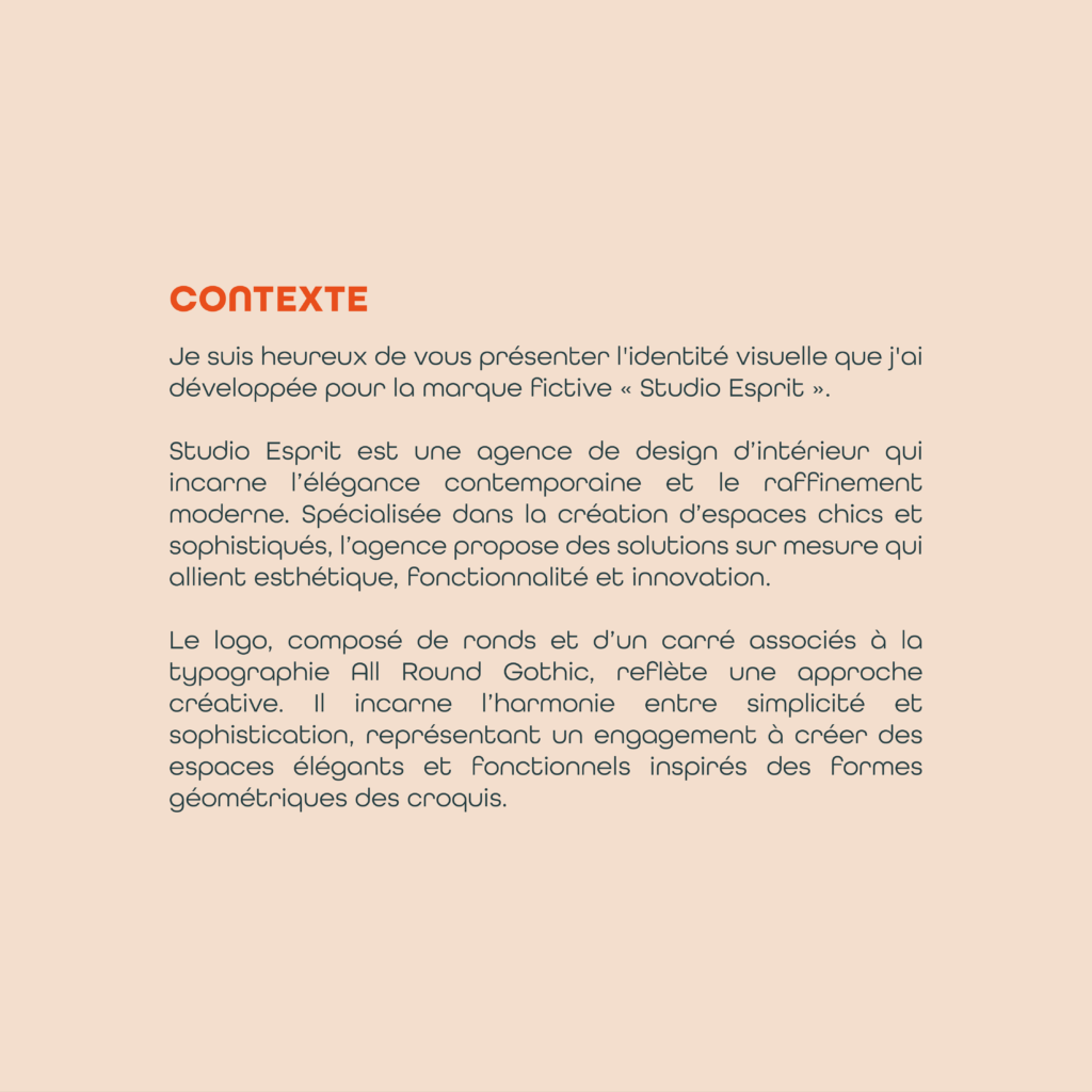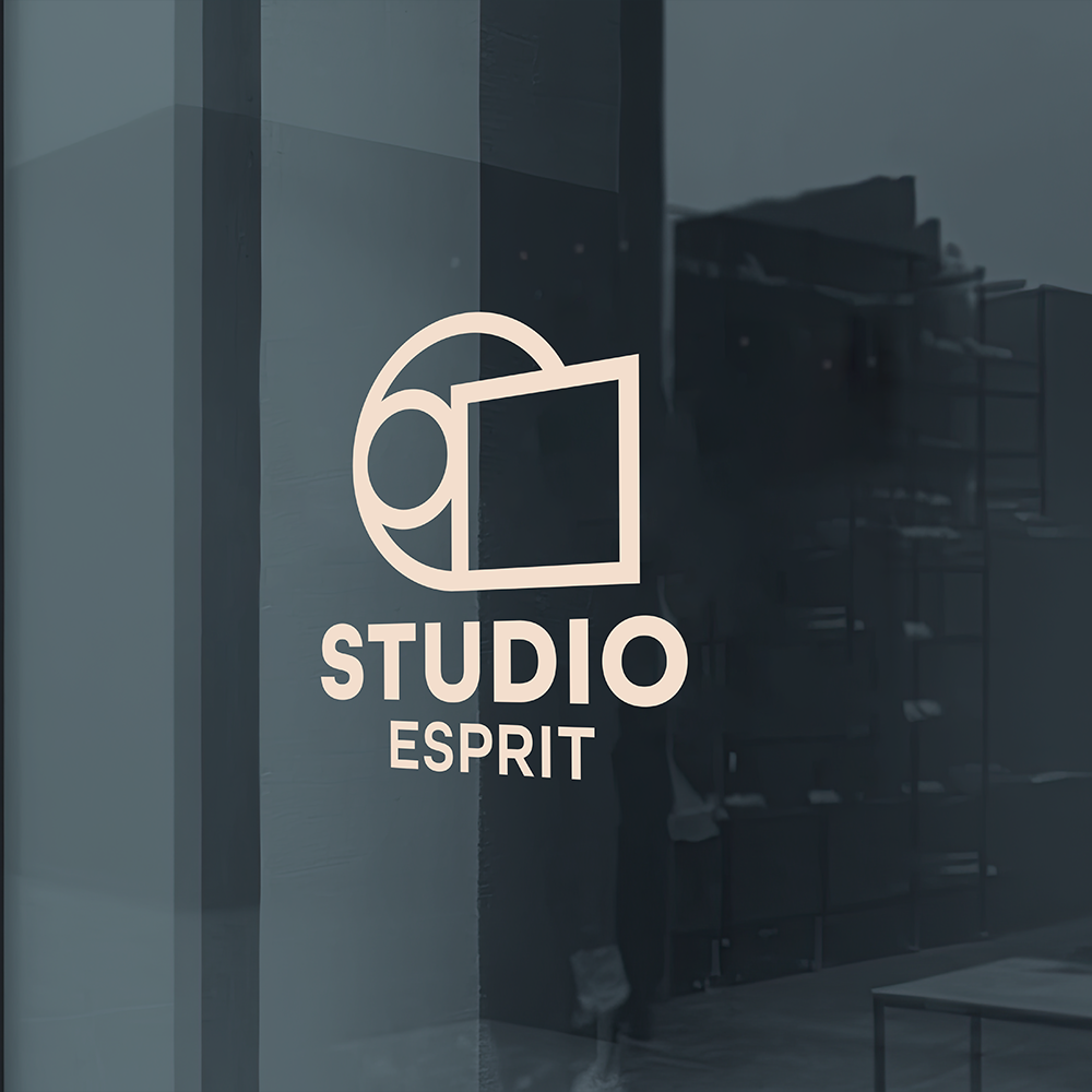 Le logo de Studio Esprit, composé de ronds et d’un carré associé à la typographie All Round Gothic, reflète une approche créative. Il incarne l’harmonie entre simplicité et sophistication, représentant un engagement à créer des espaces élégants et fonctionnels inspirés par les formes géométriques des croquis.