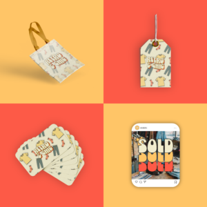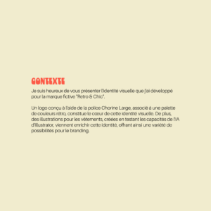 Un logo conçu à l’aide de la police Chorine Large, associé à une palette de couleurs rétro, constitue le cœur de cette identité visuelle. De plus, des illustrations pour les vêtements, créées en testant les capacités de l’IA d’Illustrator, viennent enrichir cette identité, offrant ainsi une variété de possibilités pour le branding.